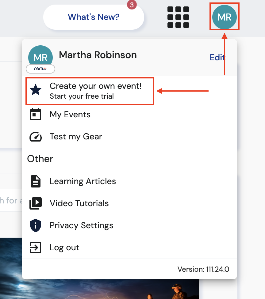 If you do not see this option, please click on your user avatar in the top right corner of your screen, and select "Create your own event".