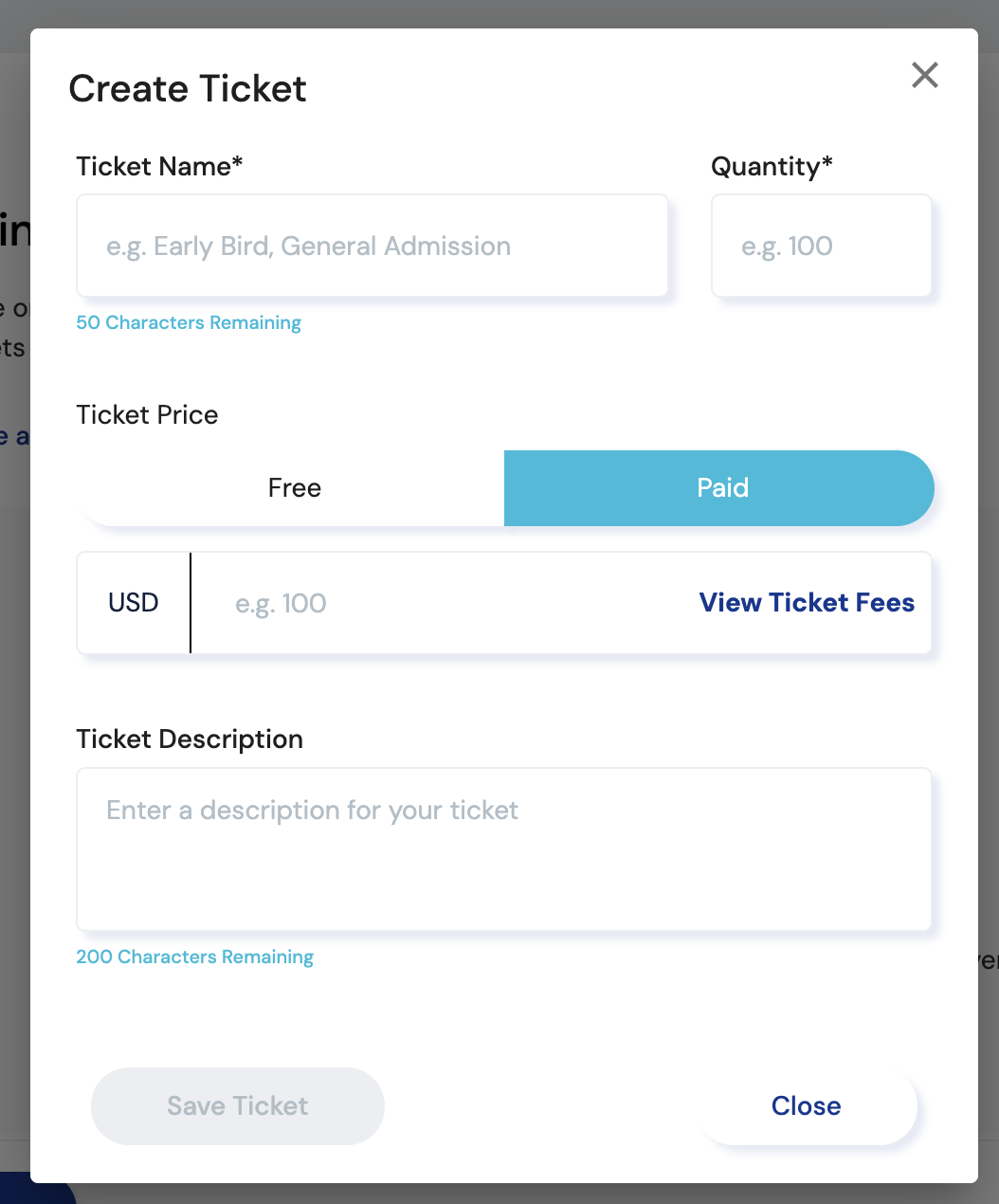 Ticket Price: Choose between a free or paid ticket. For a paid ticket, you can enter your desired ticket price here as well - please see the section below for a detailed breakdown of the ticket fees.