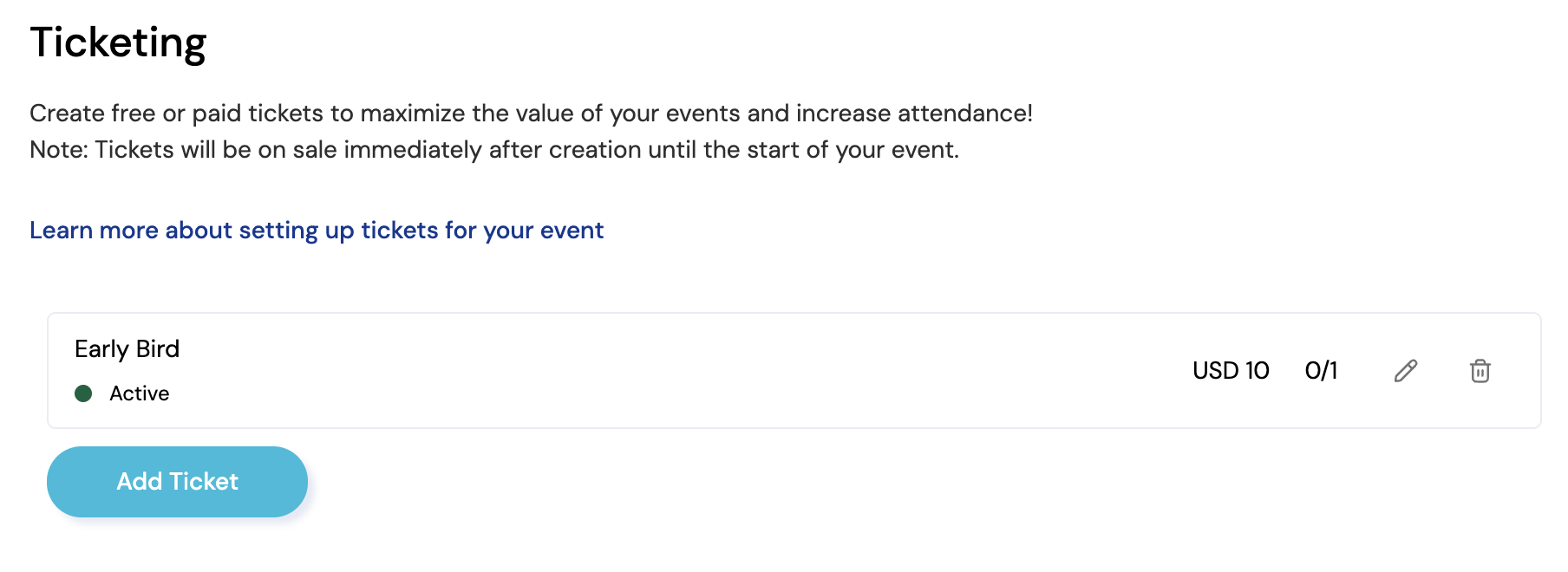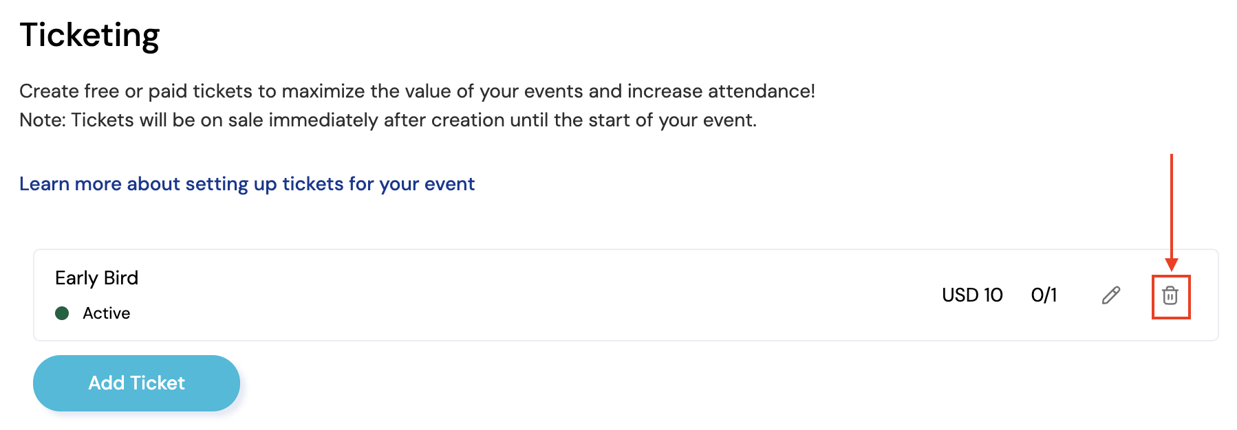 If you wish to delete a ticket, you can do so by clicking the trash icon next to the tier you wish to delete.