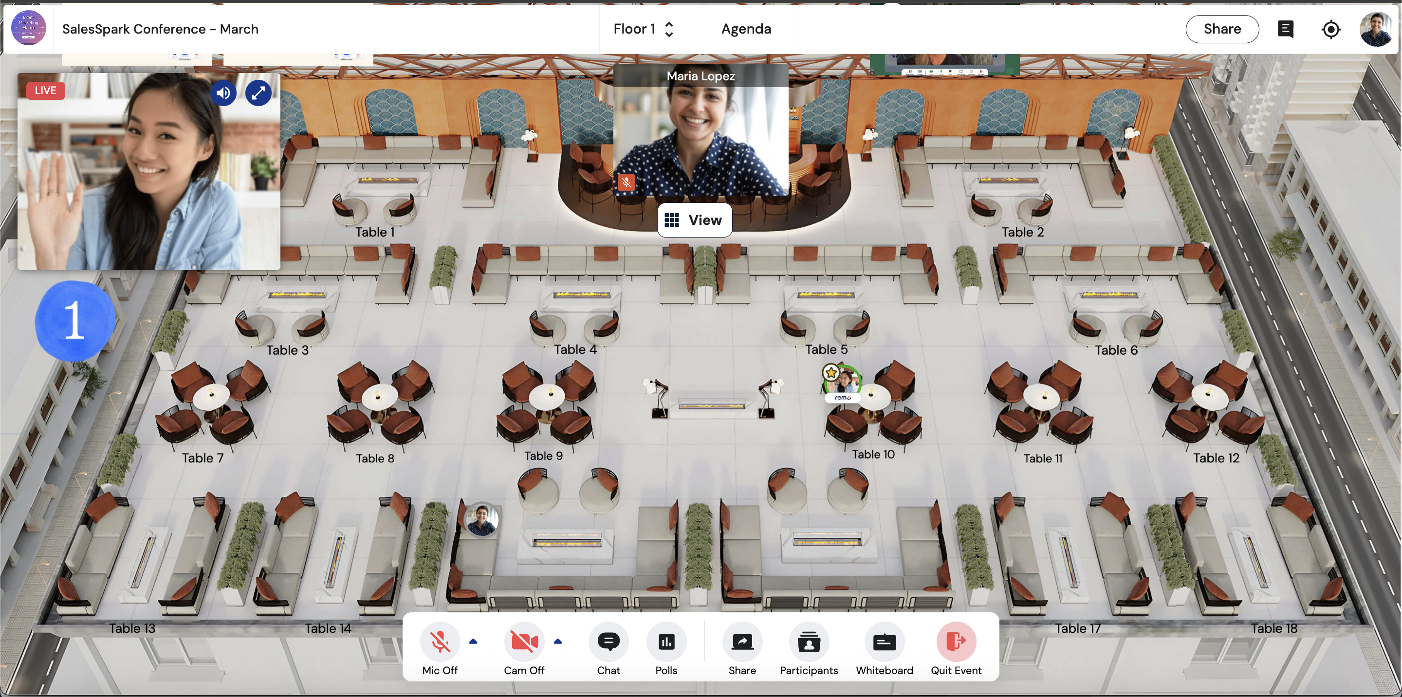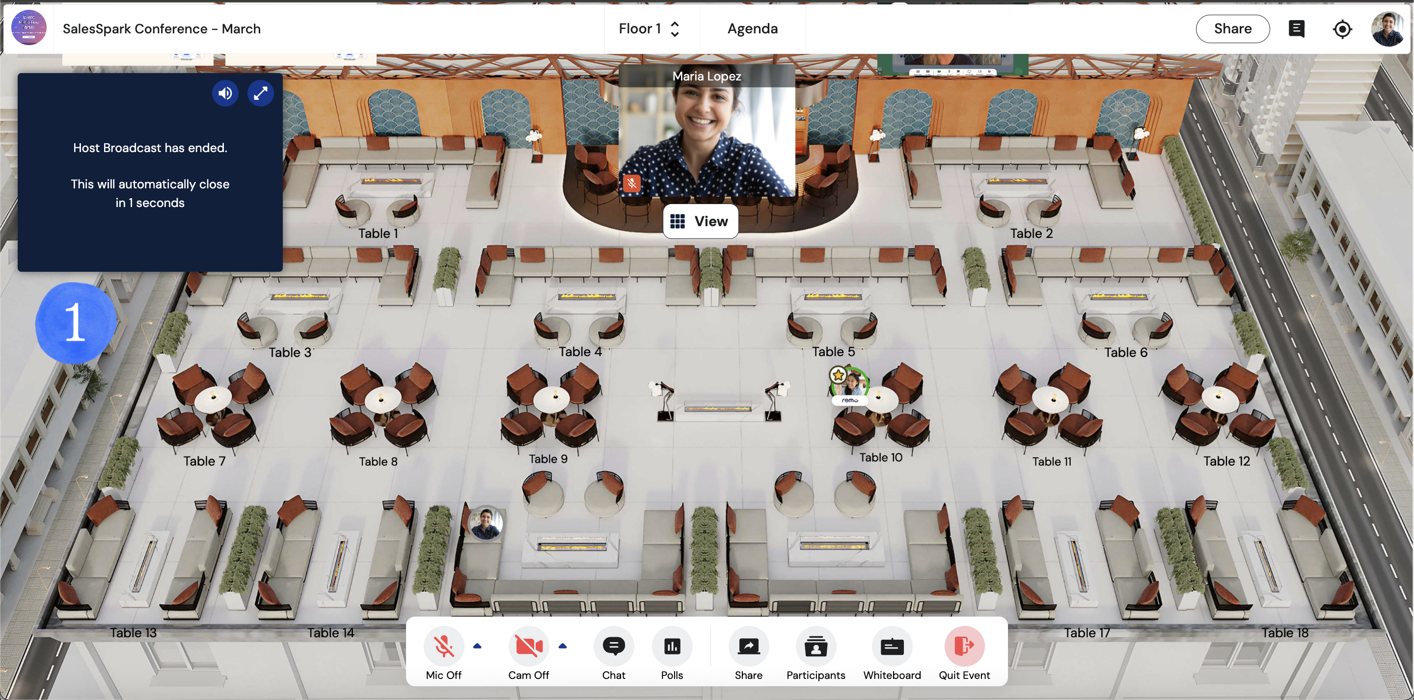 2. During a broadcast, guests can engage in conversations at tables, move around the space, and continue their usual interactions in Conversation Mode.