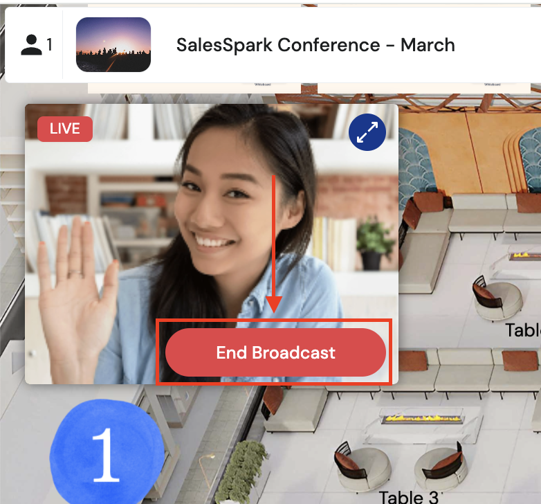 7. While broadcasting live, you can still continue as you would in Conversation Mode - i.e. you can move to another table, move floors, send chat messages e.t.c. However, until you end the broadcast, you cannot: