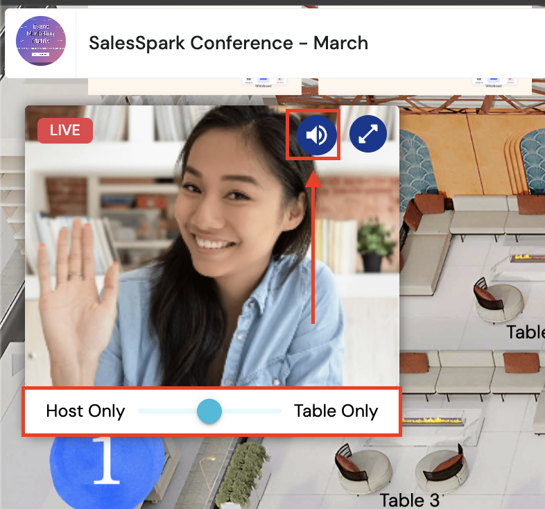 4. Guests can also click on the volume icon to control the volume of your broadcast stream vs. the volume of their current table conversation.