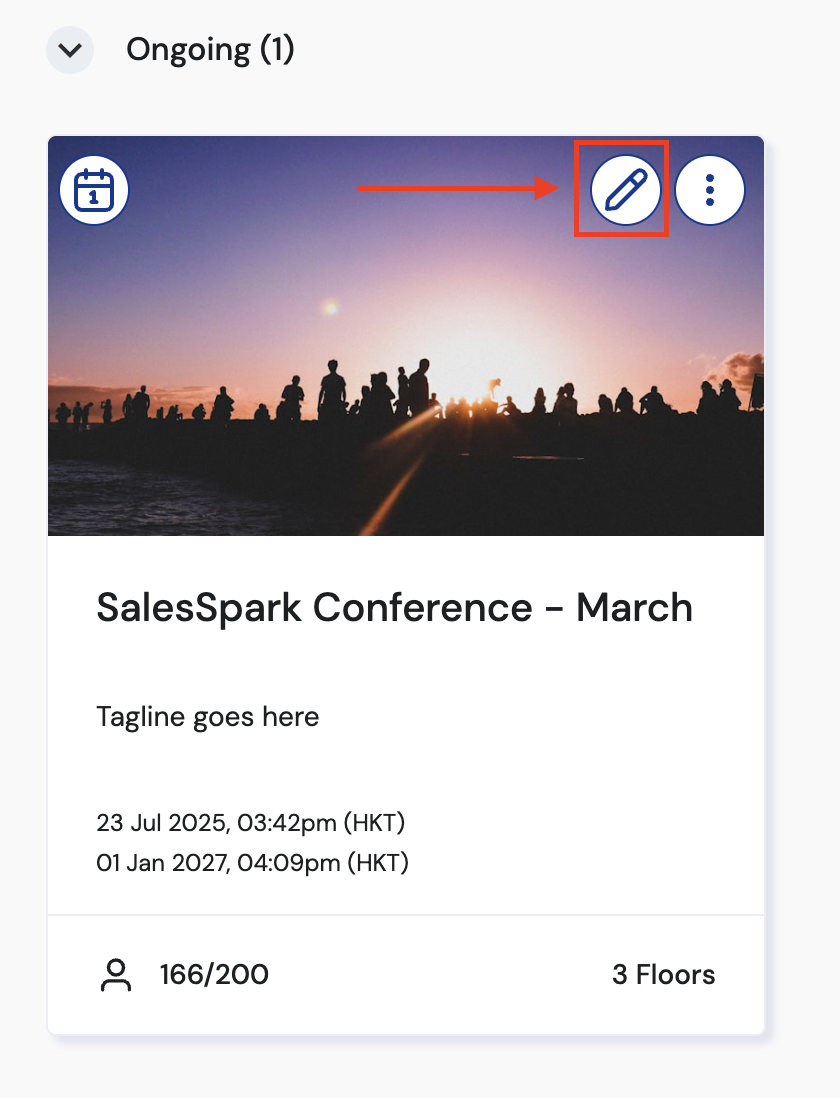 1. Go to your My Events dashboard and locate the event you’d like to live stream. Click the pencil icon to go the event’s settings
