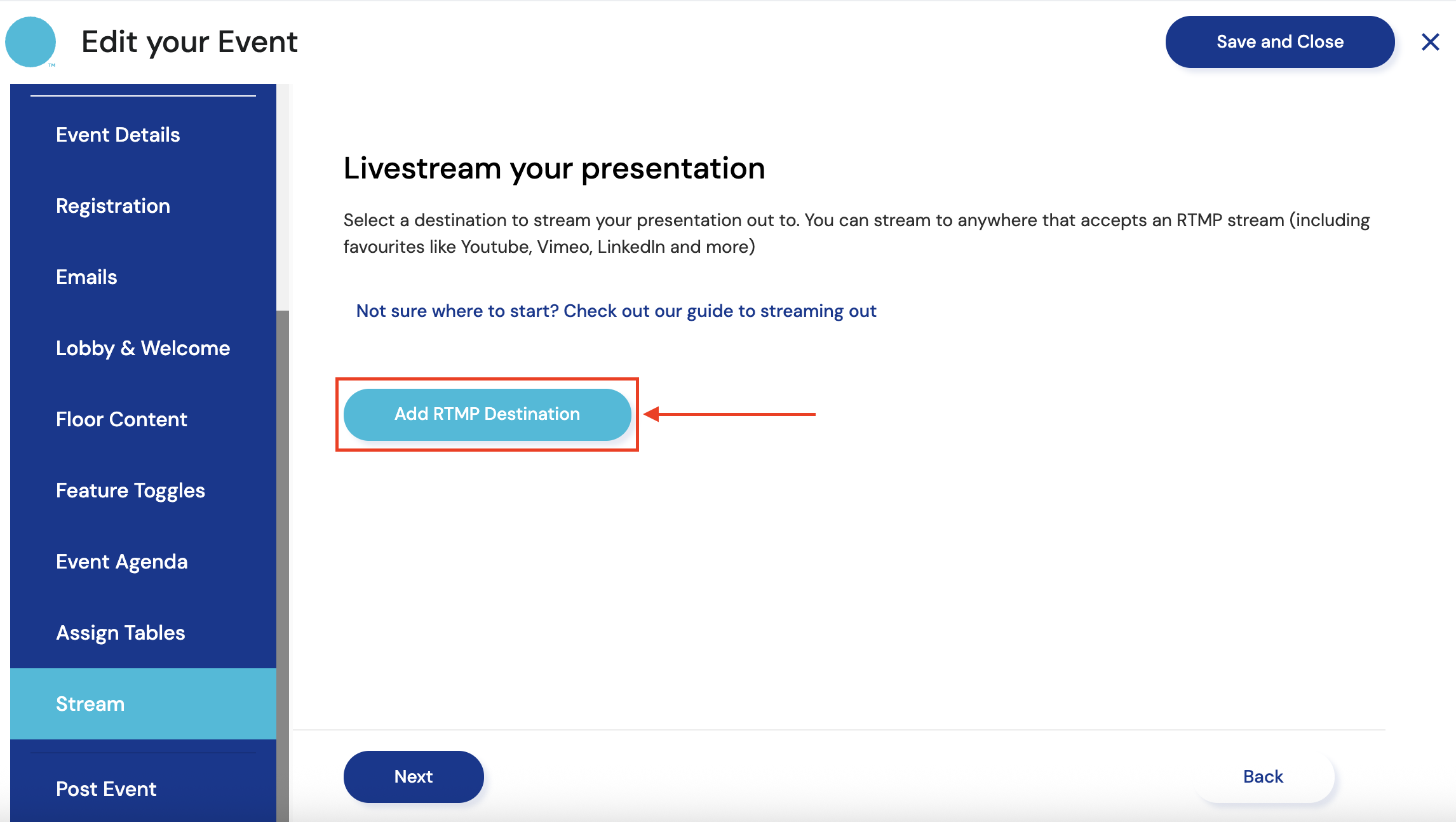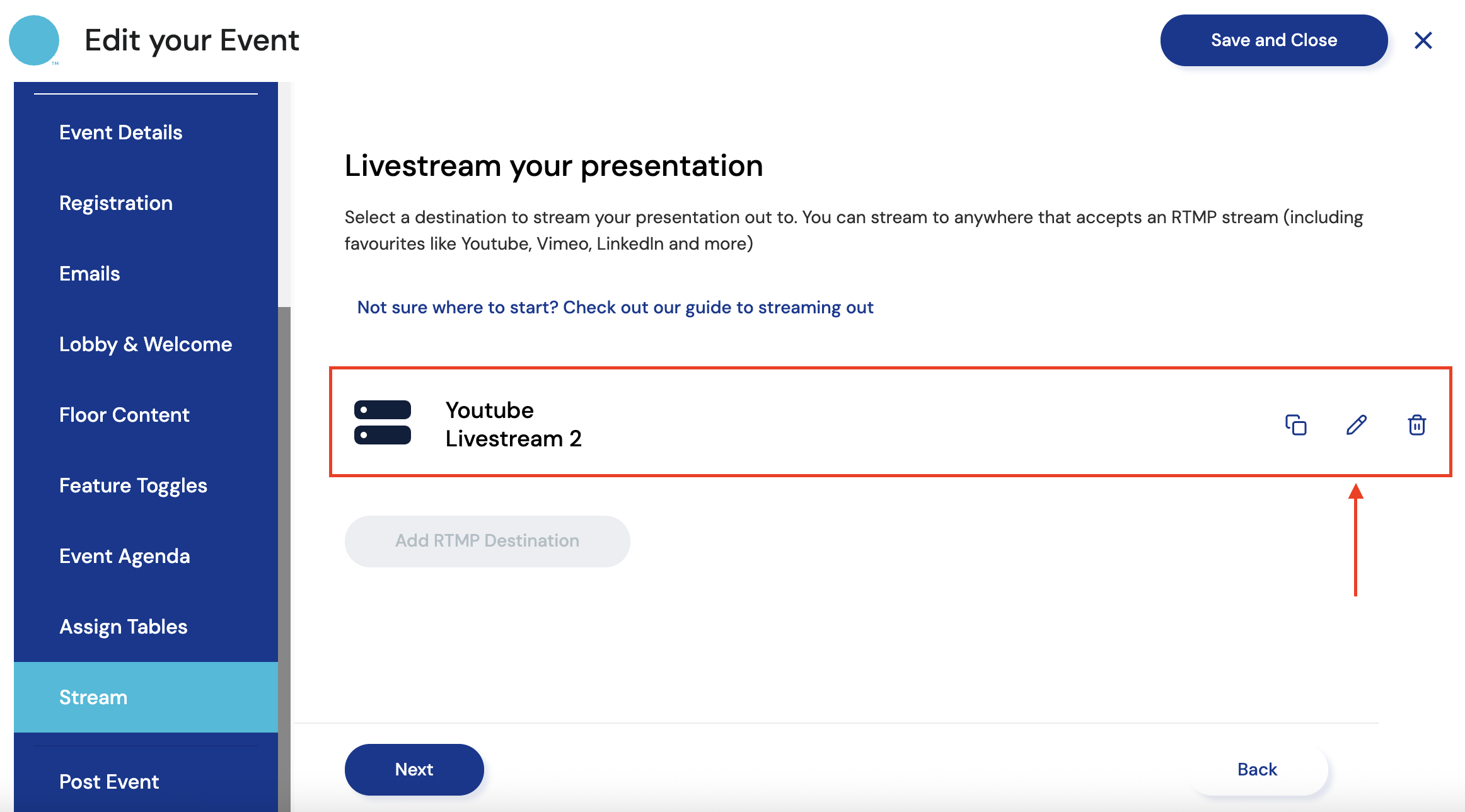 - Deleting your Stream Destination: If you'd prefer not ending Presentation Mode in Remo, you can instead go into your event's settings and delete the destination directly. This will immediately stop any active live streams from that event without interrupting your event on Remo. Using this option though, means you cannot restart your stream later in the event.