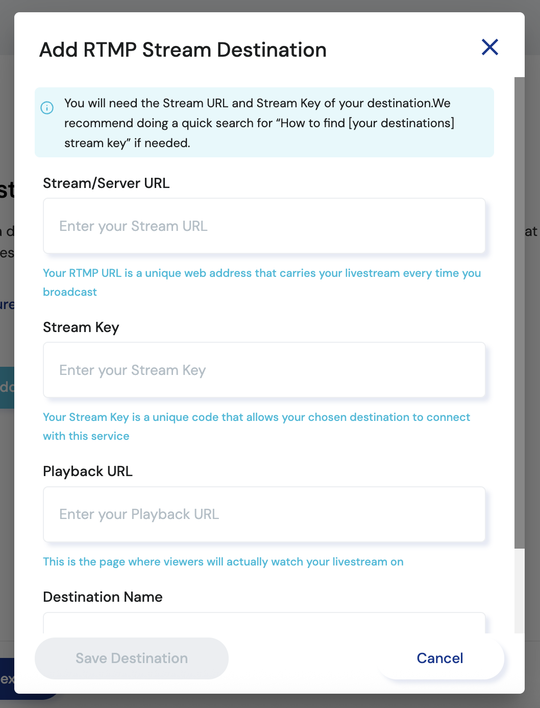 3. Click on ‘Add RTMP Destination’