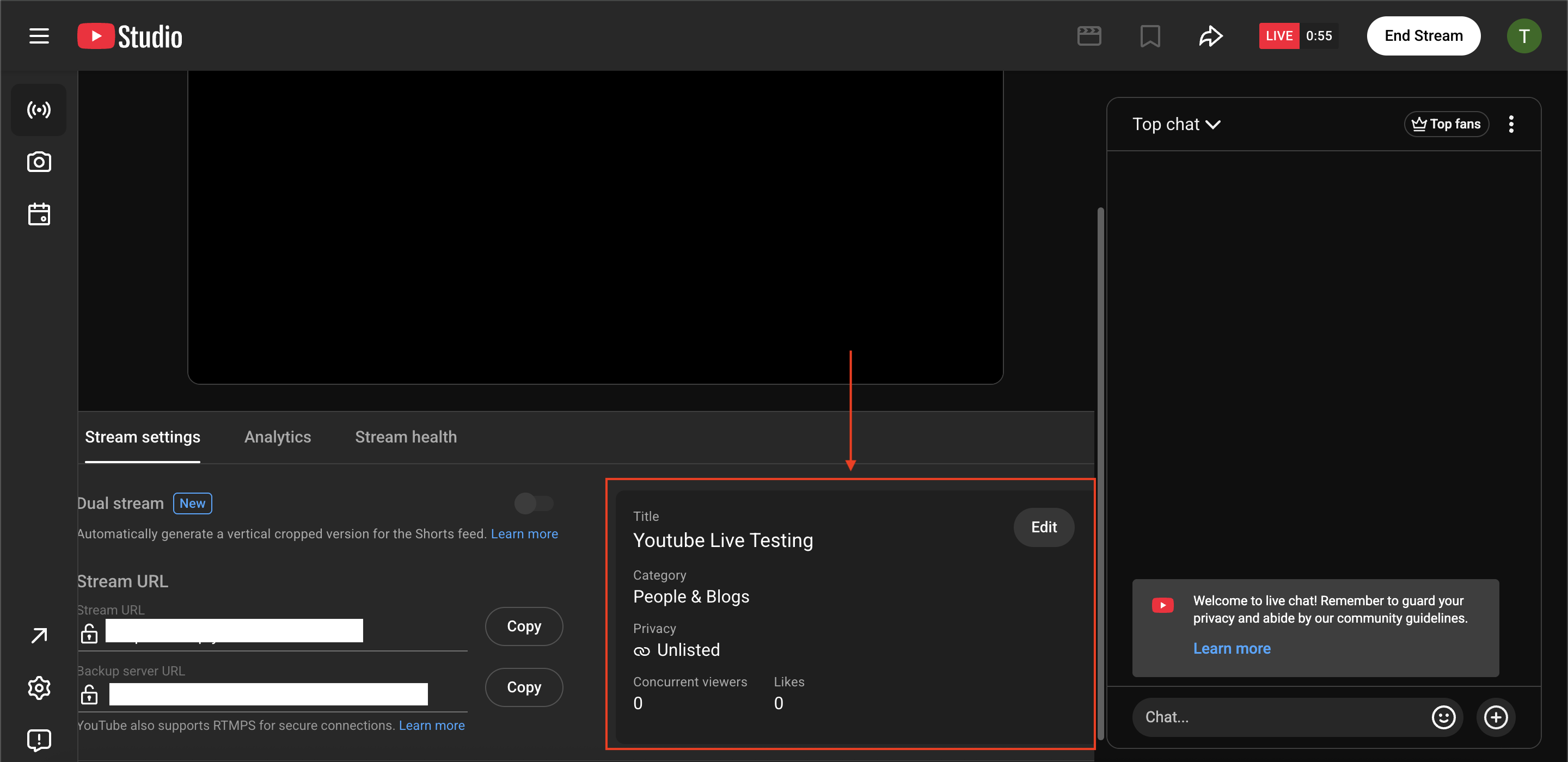 From here, you can adjust live stream settings such as the privacy of the livestream, title, description etc.