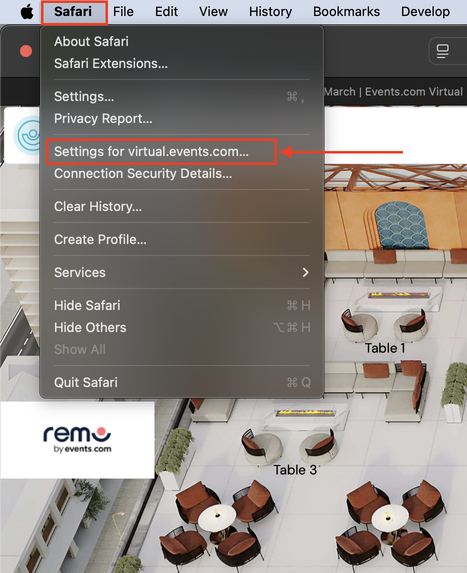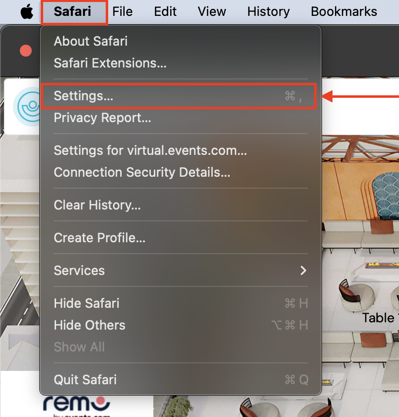 1. When in the Remo Event Space, click ‘Safari’ in the top menu bar and then select ‘Settings’