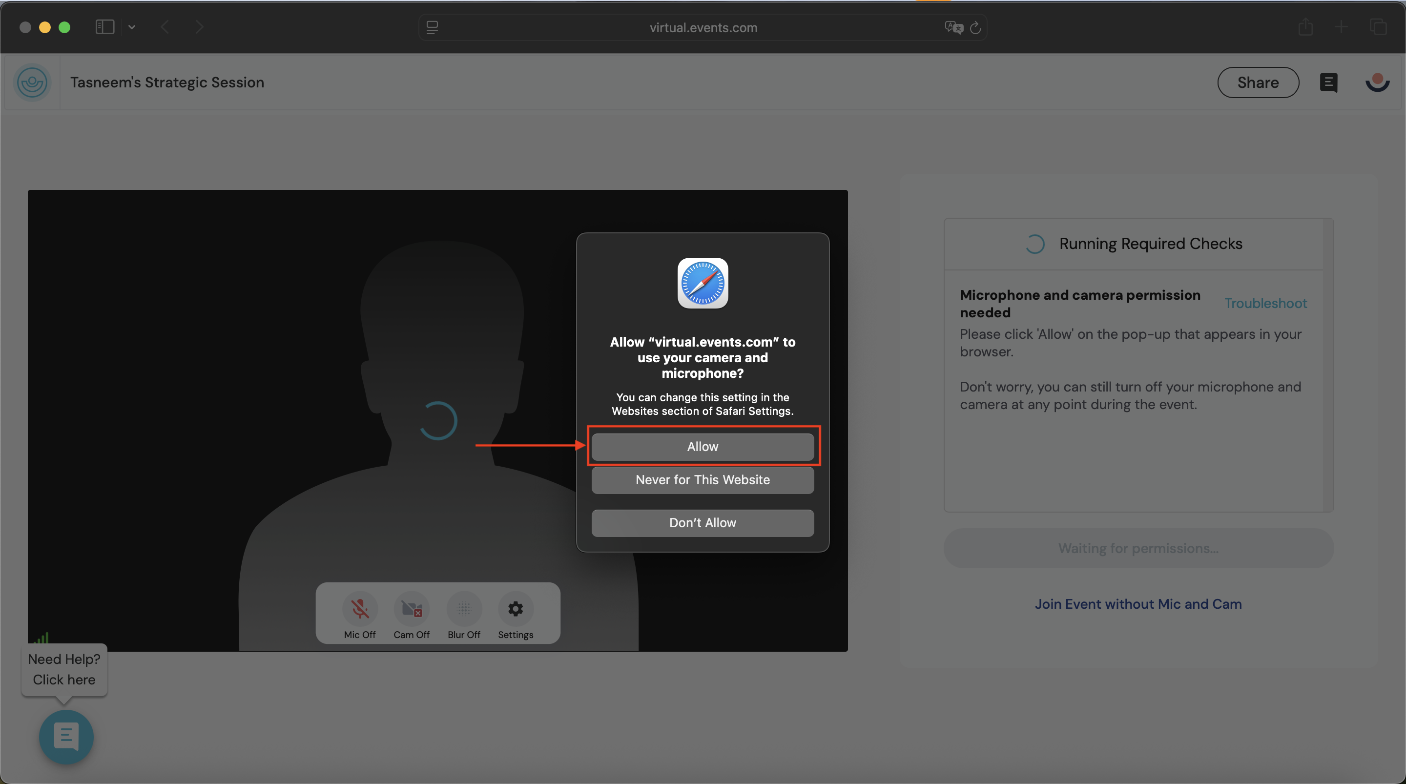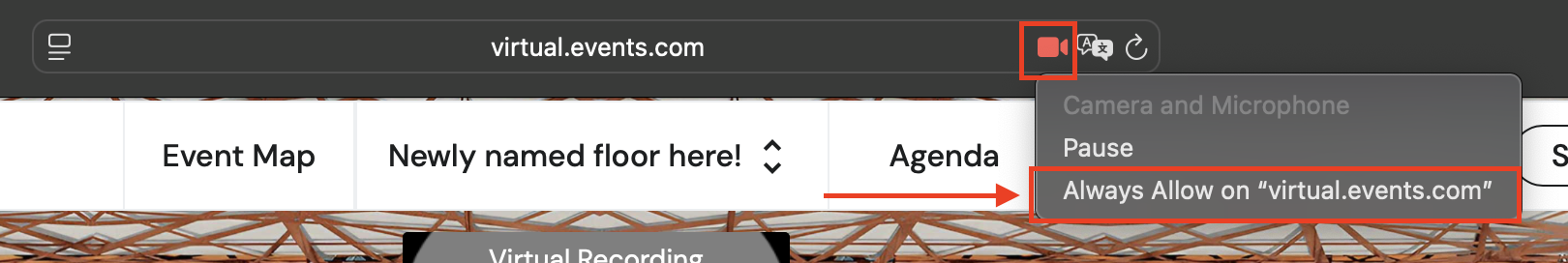 2. For the smoothest experience, click on the red video or microphone button on the right hand side of the URL and click ‘Always Allow on “live.remo.co”’ or 'Always Allow on “virtual.events.com”’