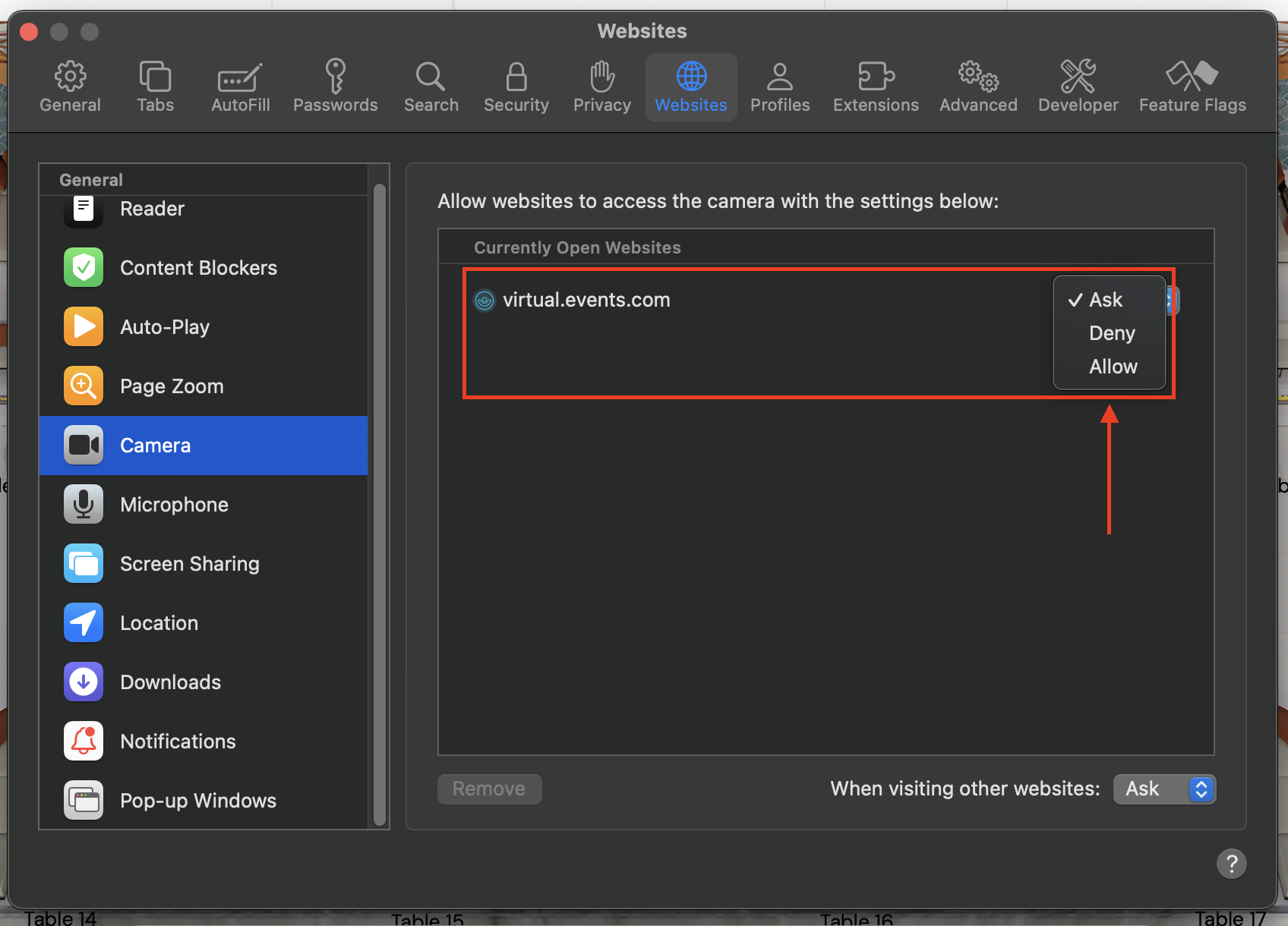 2. Select the ‘Websites’ tab and click on ‘Camera’. Next to live.remo.co or virtual.events.com, select ‘Allow’ or 'Ask' from the dropdown menu