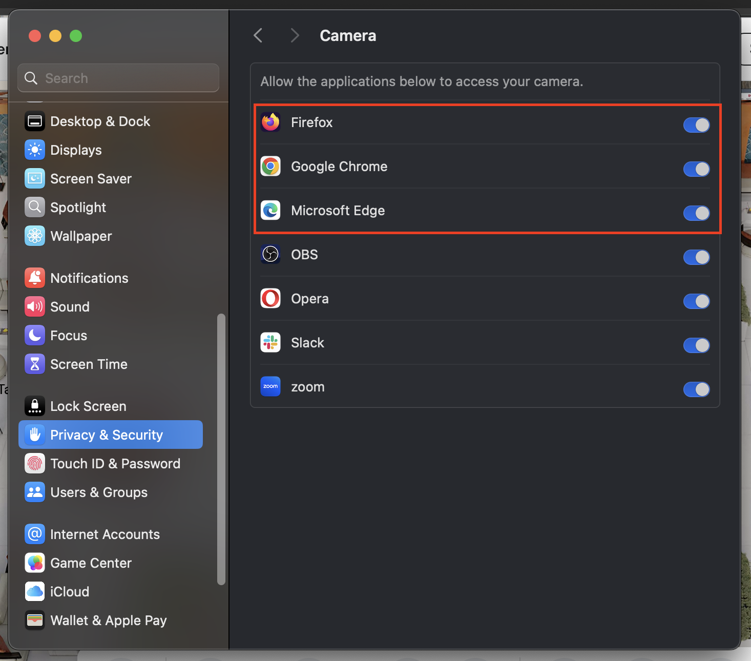 3. Click on 'Camera' from the list of options, and make sure the toggle next to the browser you are using is turned ON (make sure this is a Remo supported browser)