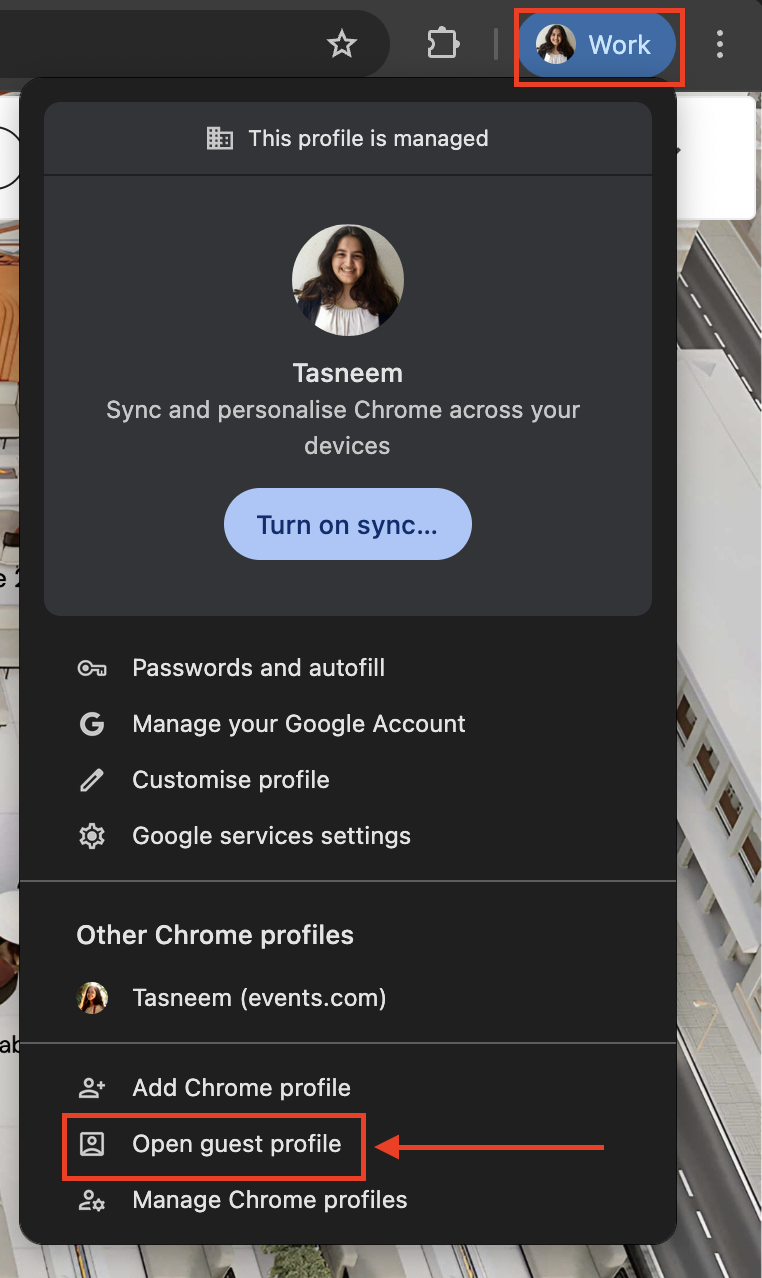 2. Guest Mode on Chrome: Click your Profile Picture in the upper right corner of your screen, and then click 'Open guest profile'