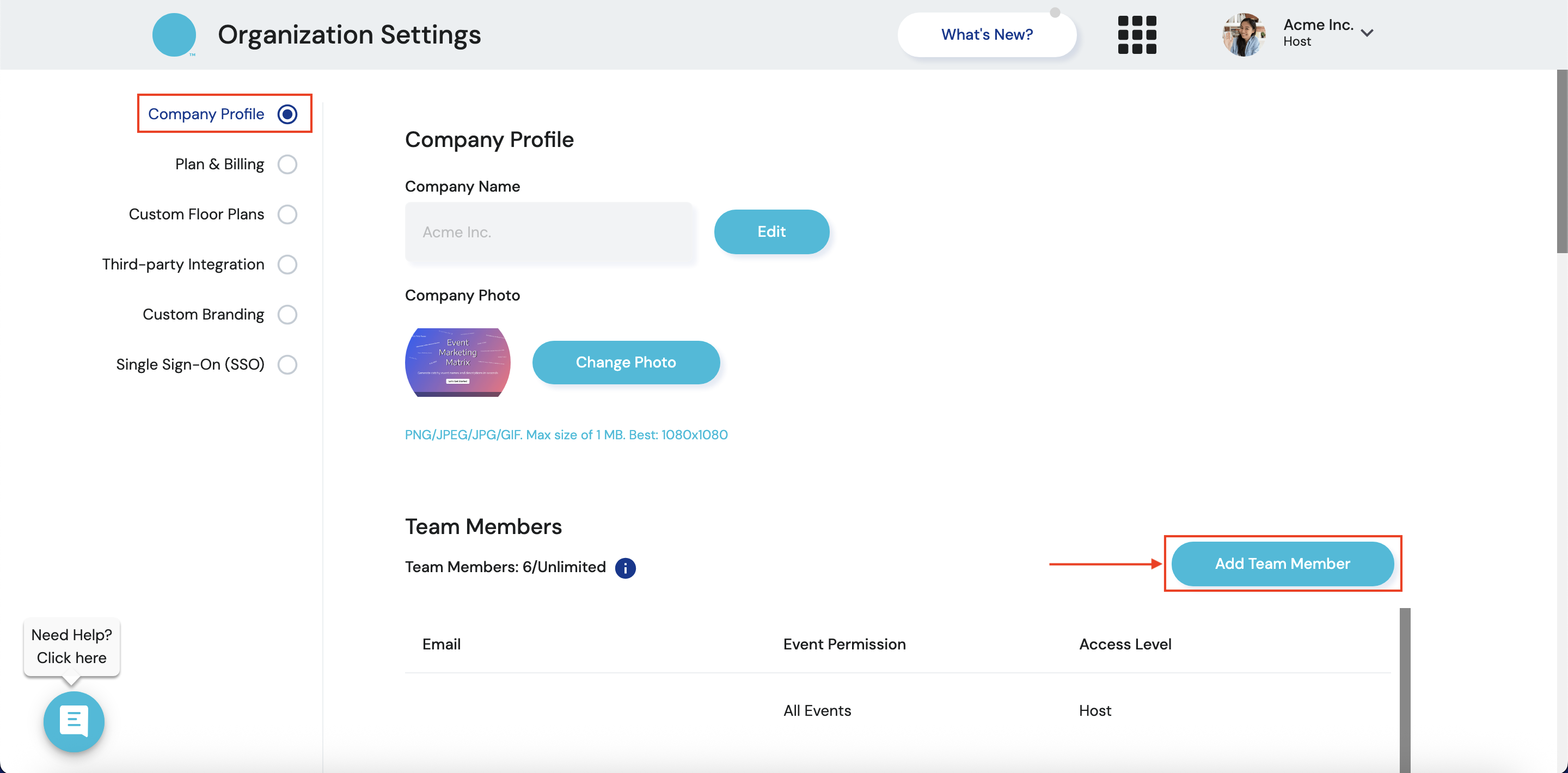 3. Under Company profile in the Team Members section, click ‘Add Team Member’ button