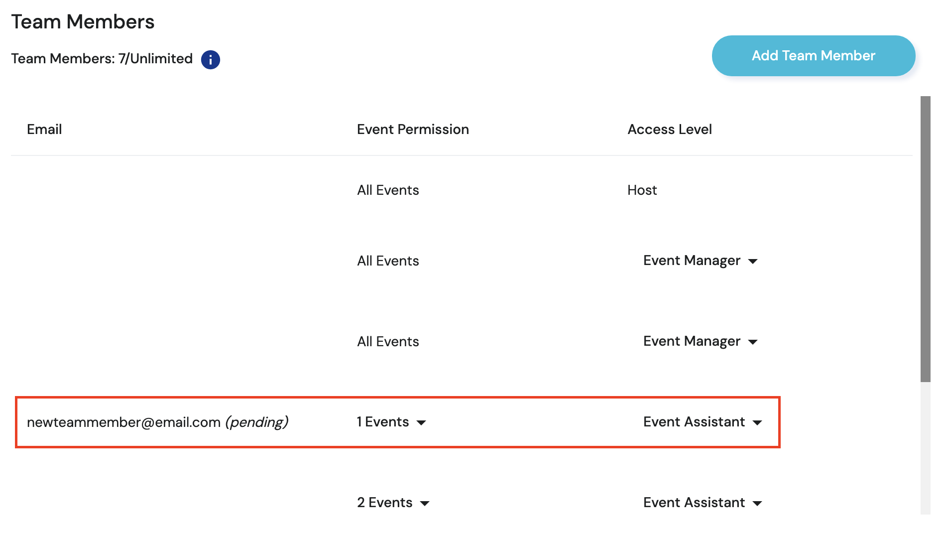 6. Once the new Team Member accepts the invitation, the ‘Pending’ tag will be removed and they can now view and manage either all or designated events using their account (depending on the Access Level you've given them)