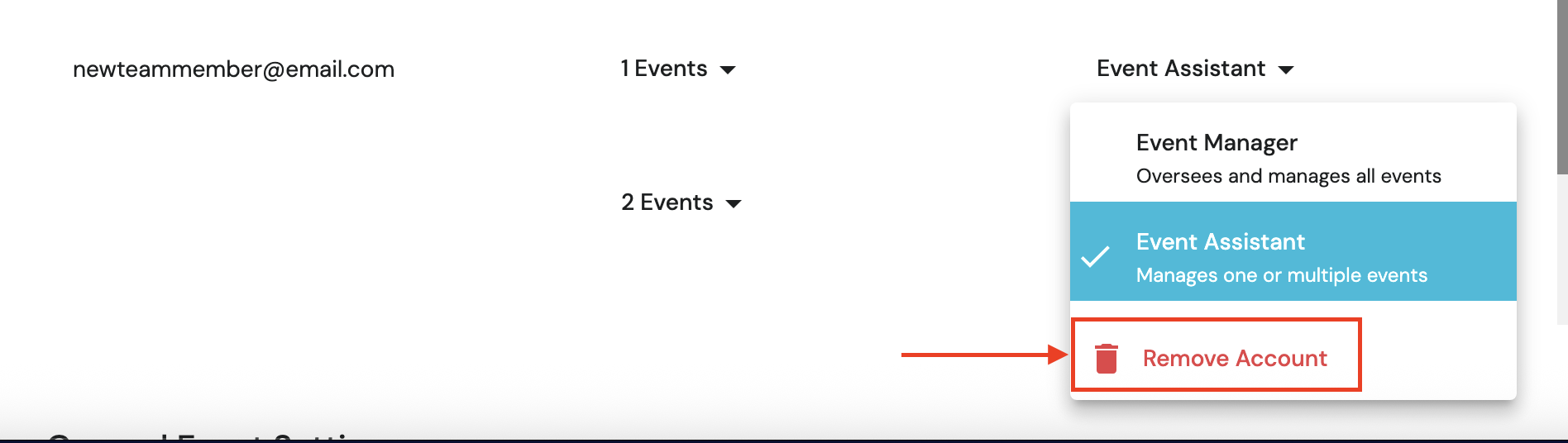 In the Team Member section, there is a column labeled Event Permission. This column will tell you which events each team member has access to (see Step 7 above).