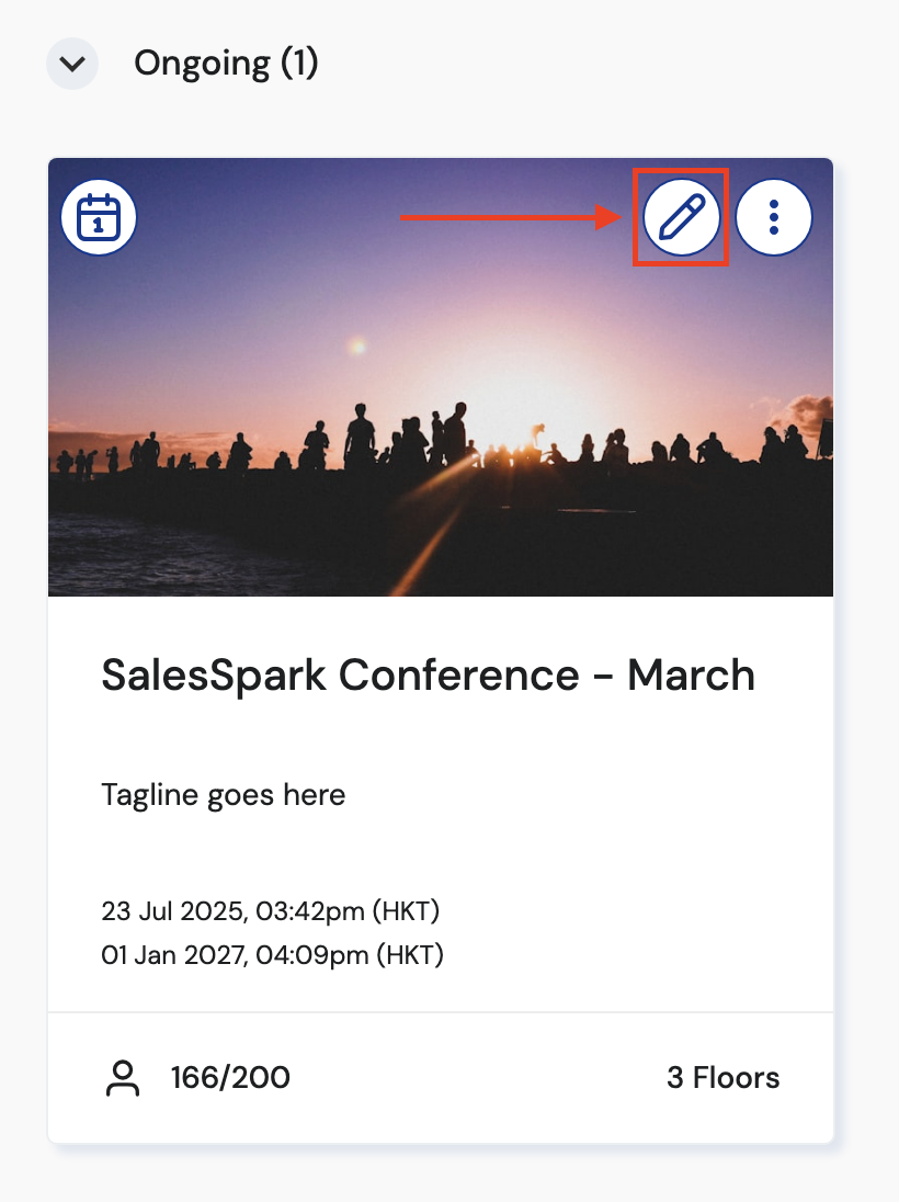 2. Click 'Create Event' if you are creating an event from scratch. If you have an event already created, search for the event and click the pencil icon in the upper right corner of the event image