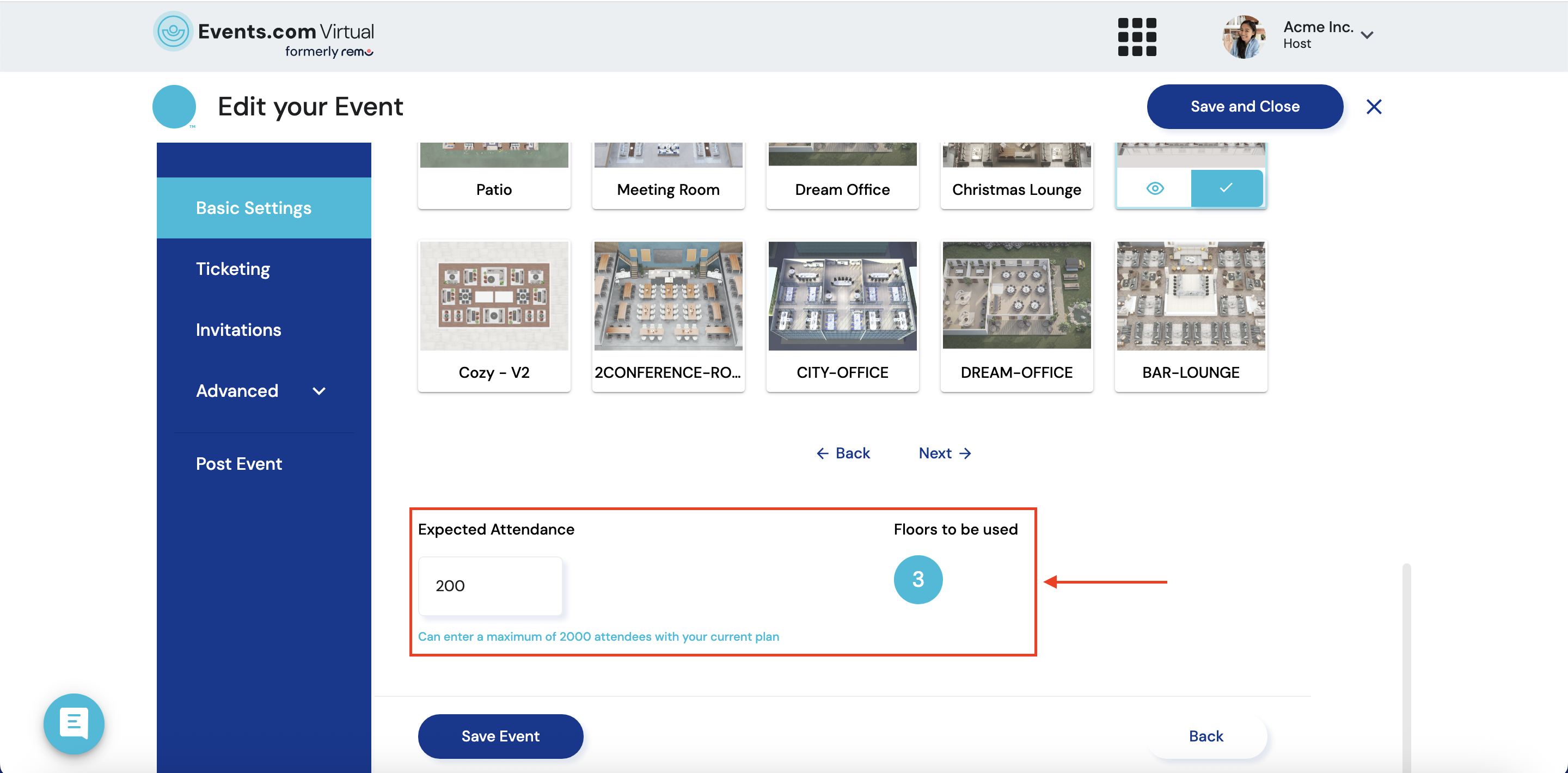 TIP: if you want more floors, simply increase your expected attendance (if your plan allows).