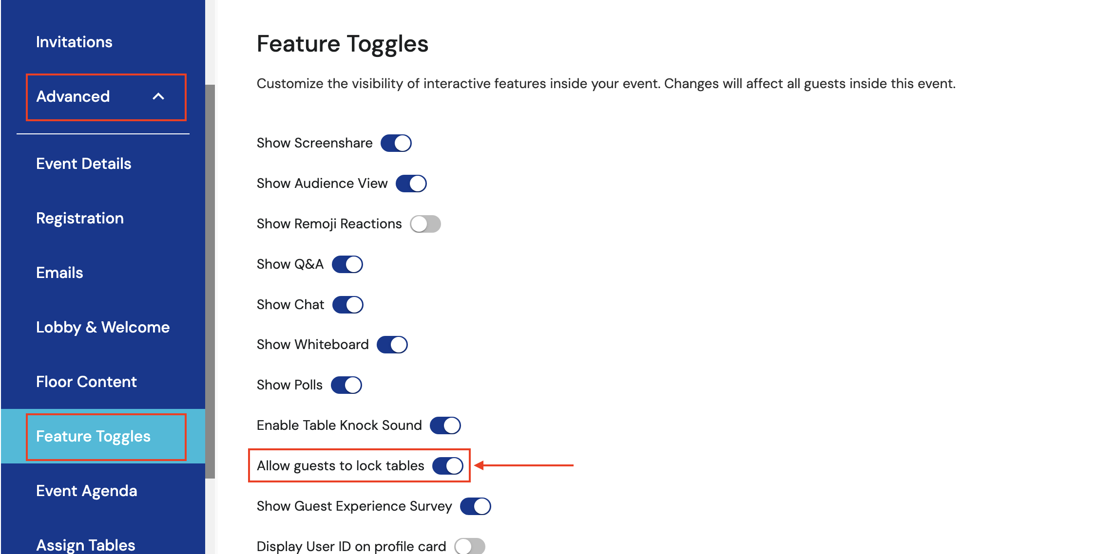Hosts can control whether guests can or cannot lock tables by enabling this functionality in Event Settings > Advanced > Feature Toggles > 'Allow guests to lock tables'.