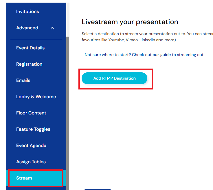 - Deleting your Stream Destination: If you'd prefer not ending Presentation Mode in Remo, you can instead go into your event's settings and delete the destination directly. This will immediately stop any active live streams from that event without interrupting your event on Remo. Using this option though, means you cannot restart your stream later in the event.