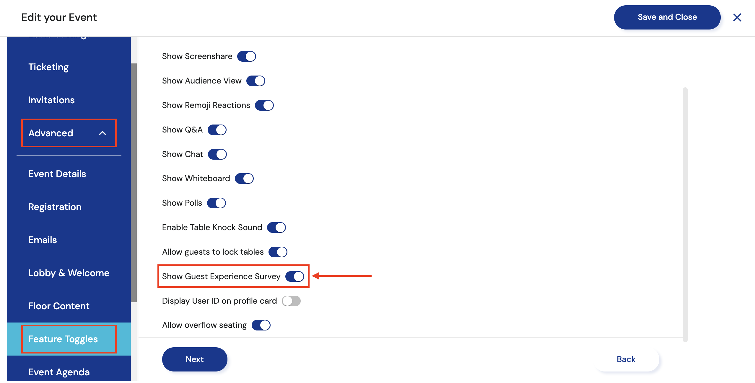 1. Navigate to Event Settings and click the 'Feature Toggles' tab