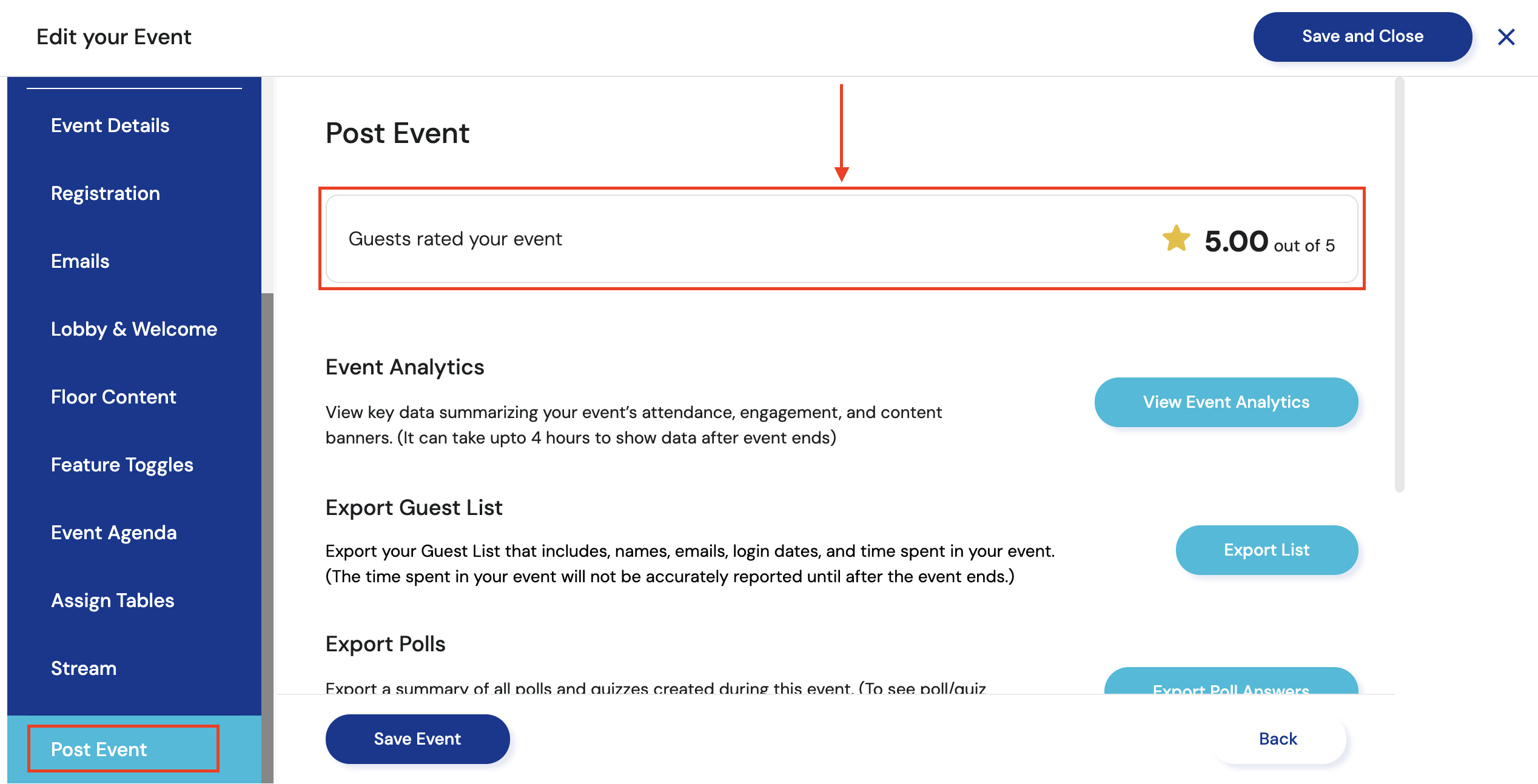 3. You should be able to see your event's average rating at the top of your post-event tab as shown below