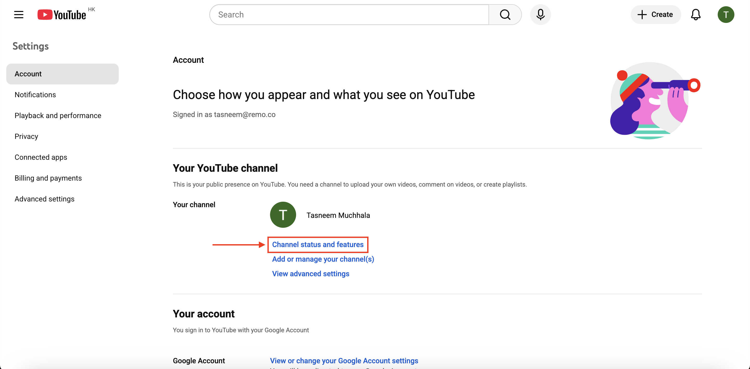 1. Open your Youtube account settings (if you're not already logged in, you will be asked to log into your Google account first)