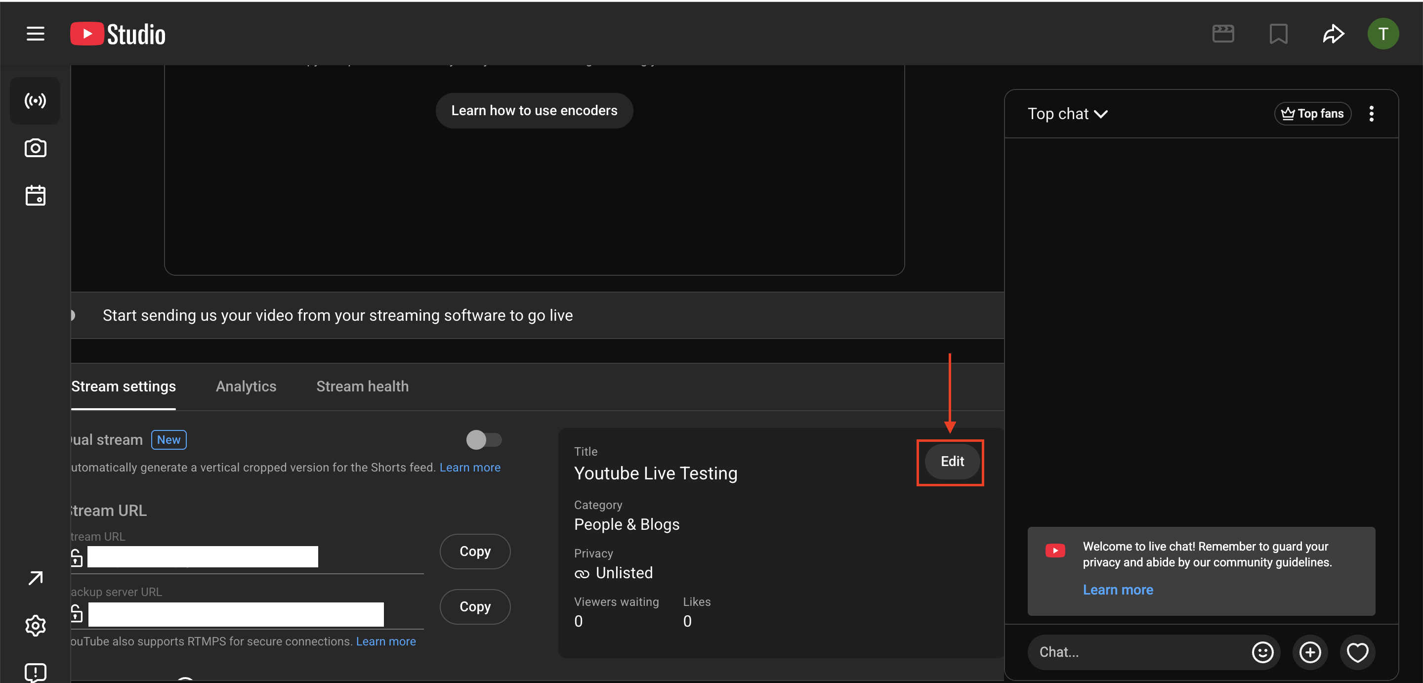 5. Click 'Edit' next to the Youtube live stream details