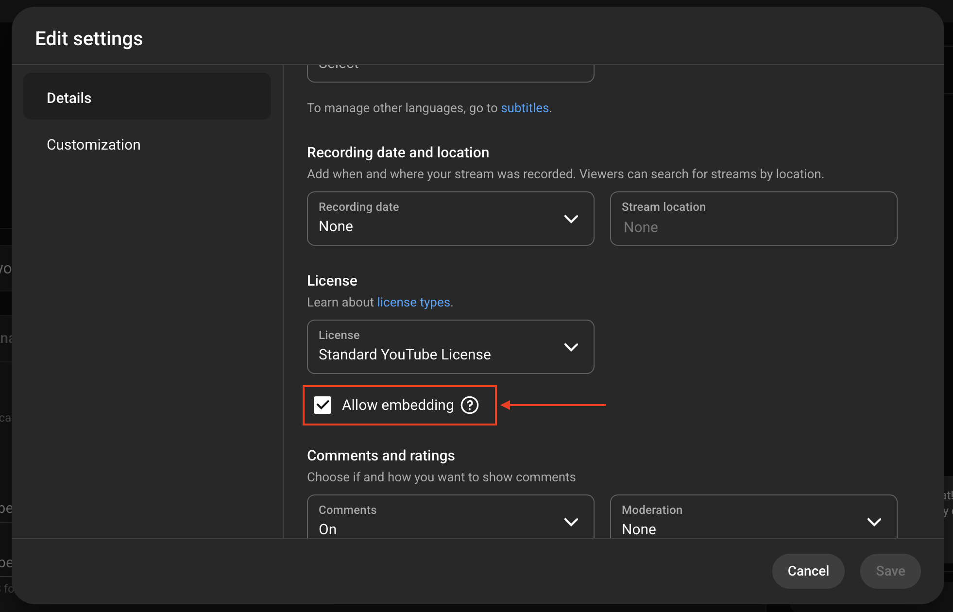 6. Under Details, scroll down to the License section, and make sure the box for 'Allow embedding' is checked