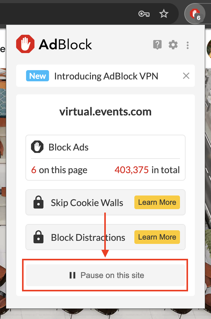 2. 「このサイトで一時停止する」の「今後も」をクリックしてください。「一度だけ」を選択した場合、次回Remoのイベントへ参加する際、必ず再度AdBlockを停止してください。