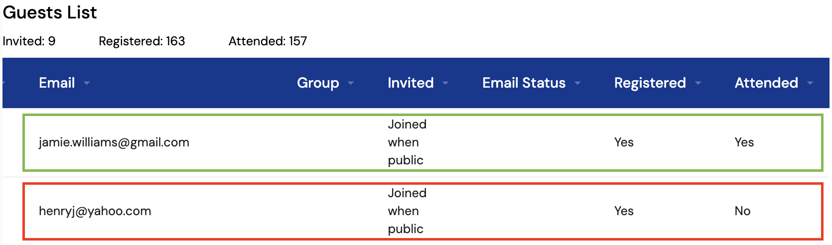 例として、上記のイベントの場合、緑で囲まれているゲストは登録し、イベントにも参加していますが、赤で囲まれているゲストは参加登録はしたものの、実際にはイベントに参加していません。