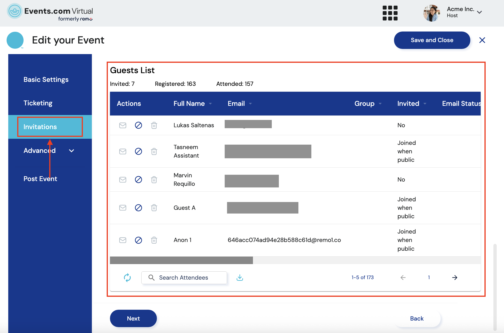 4. 招待されている、またはイベントに登録している全てのゲストがゲストリストに表示されます。