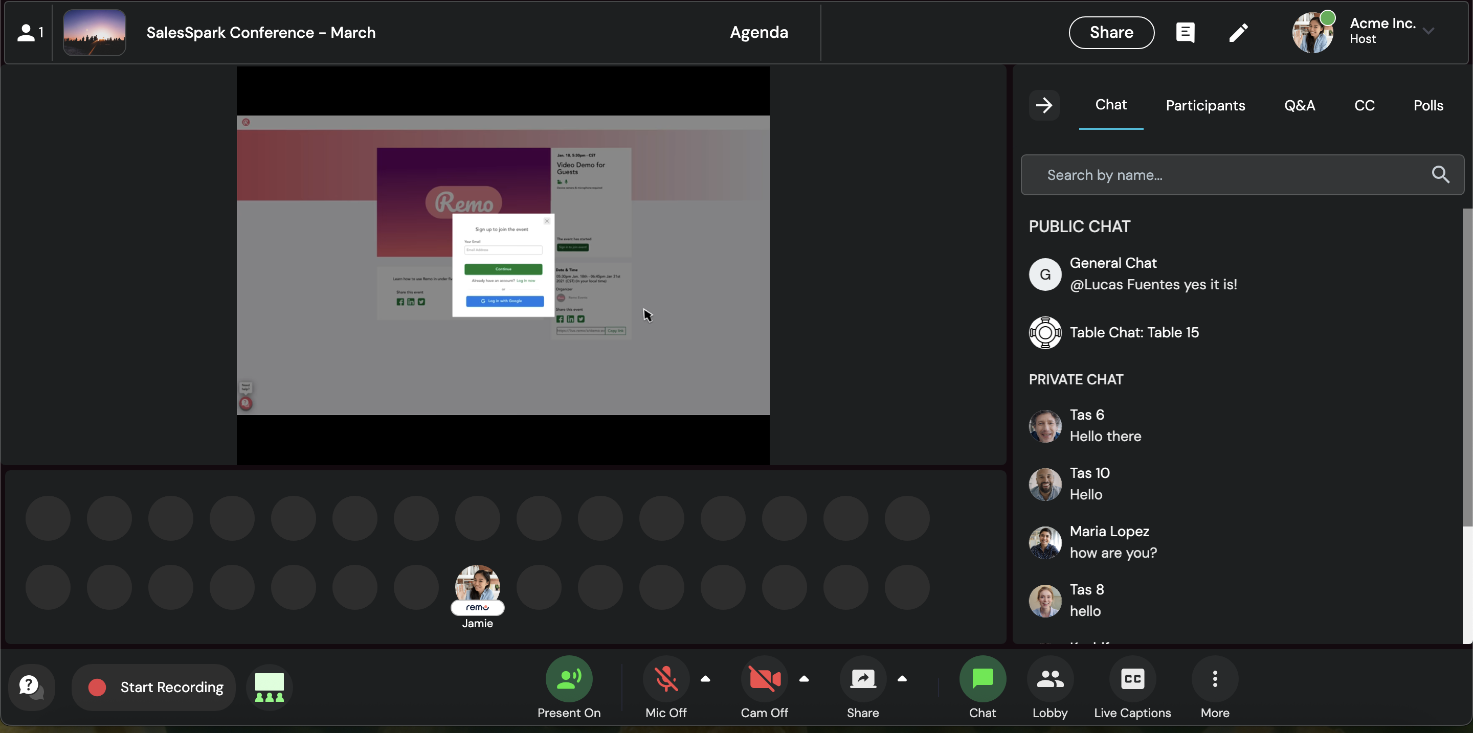 2. 各イベントスペースで「プレゼンする」をクリックして、プレゼンテーションモードに切り替え、 「マイクとカメラをオンにしてプレゼンテーションを開始する」のチェックを外してください