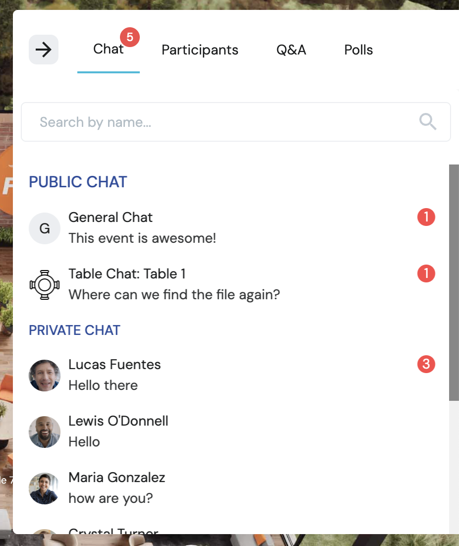 - テーブルチャットとプライベートチャットの場合は、新しいメッセージが届いた時にゲストにも通知されます。全体チャットの場合は通知されません。